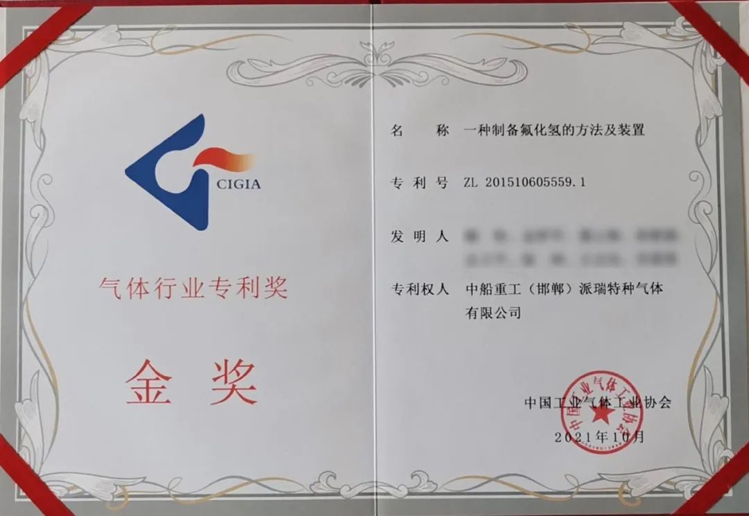 此次獲獎,是派瑞特氣公司繼2020年“一種制備三氟化氮氣體的裝置及應用”專利獲評發明專利金獎后,連續第2年獲得該項榮譽。