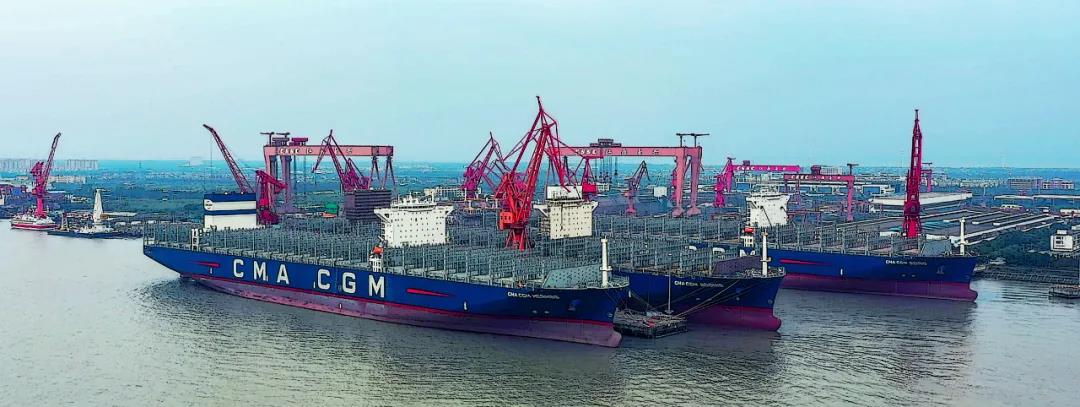 “海上綠巨人”系列箱船是滬東中華近期的重點(diǎn)產(chǎn)品。三艘15000TEU集裝箱船列隊(duì)整齊,滬東中華建造團(tuán)隊(duì)開足馬力,奮戰(zhàn)金秋。該型號(hào)集裝箱船是當(dāng)今世界綠色環(huán)保船型,國(guó)產(chǎn)化率達(dá)到90%,可靈活布置于全球各個(gè)重要航線。