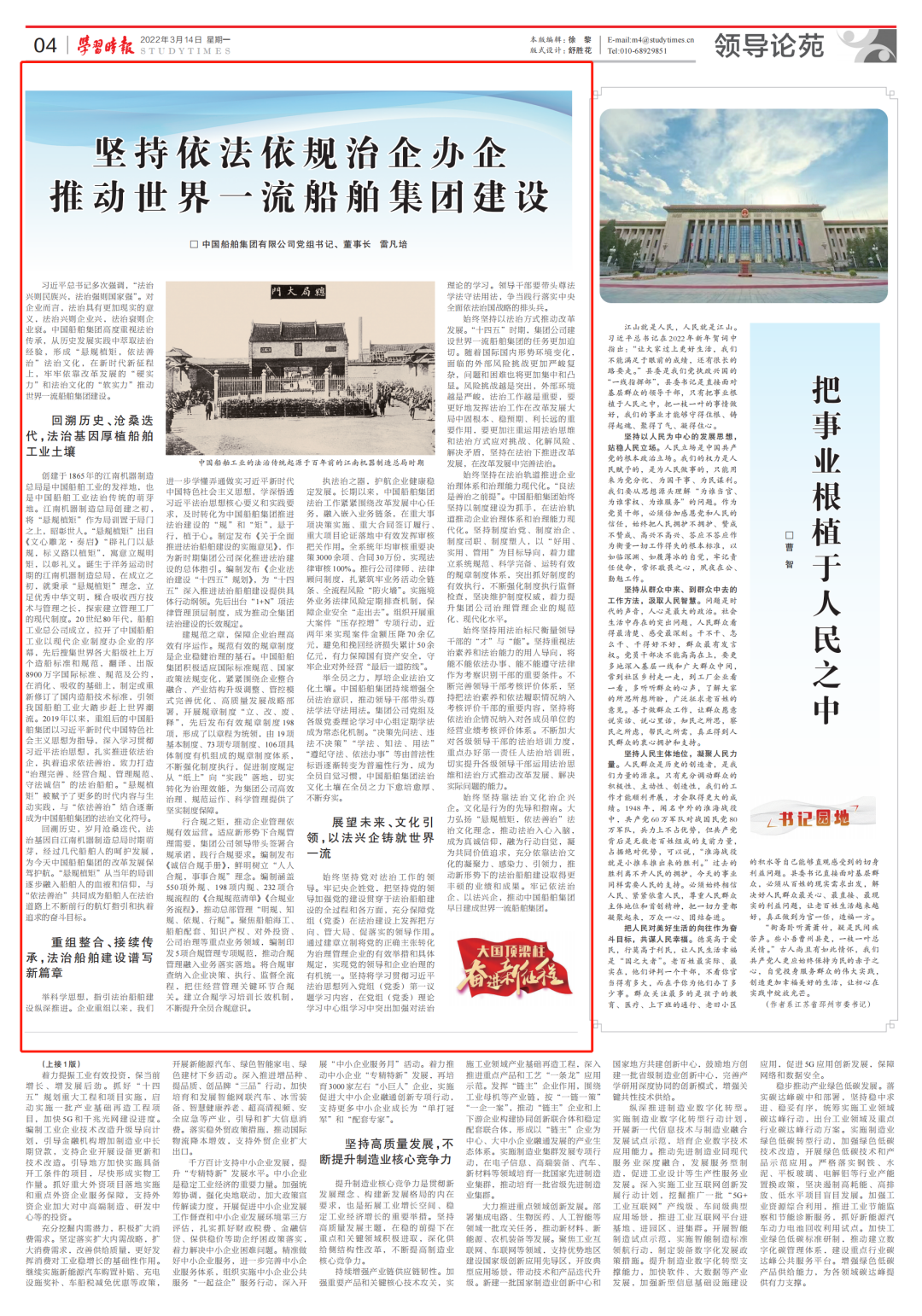 3月14日,《學習時報》刊發中國船舶集團有限公司黨組書記、董事長雷凡培的署名文章《堅持依法依規治企辦企 推動世界一流船舶集團建設》,全文如下: