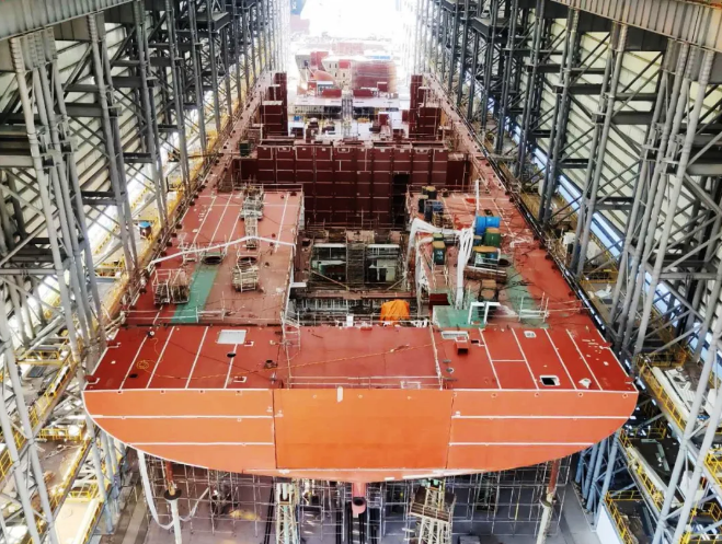 ▲機(jī)艙成型,室內(nèi)船臺(tái)生產(chǎn)流程基本打通