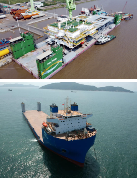 通常單一的部件運輸任務可利用甲板運輸駁船、半潛運輸駁船實現。上船院具有6000~100000載重噸的甲板運輸/半潛船的設計建造船型。